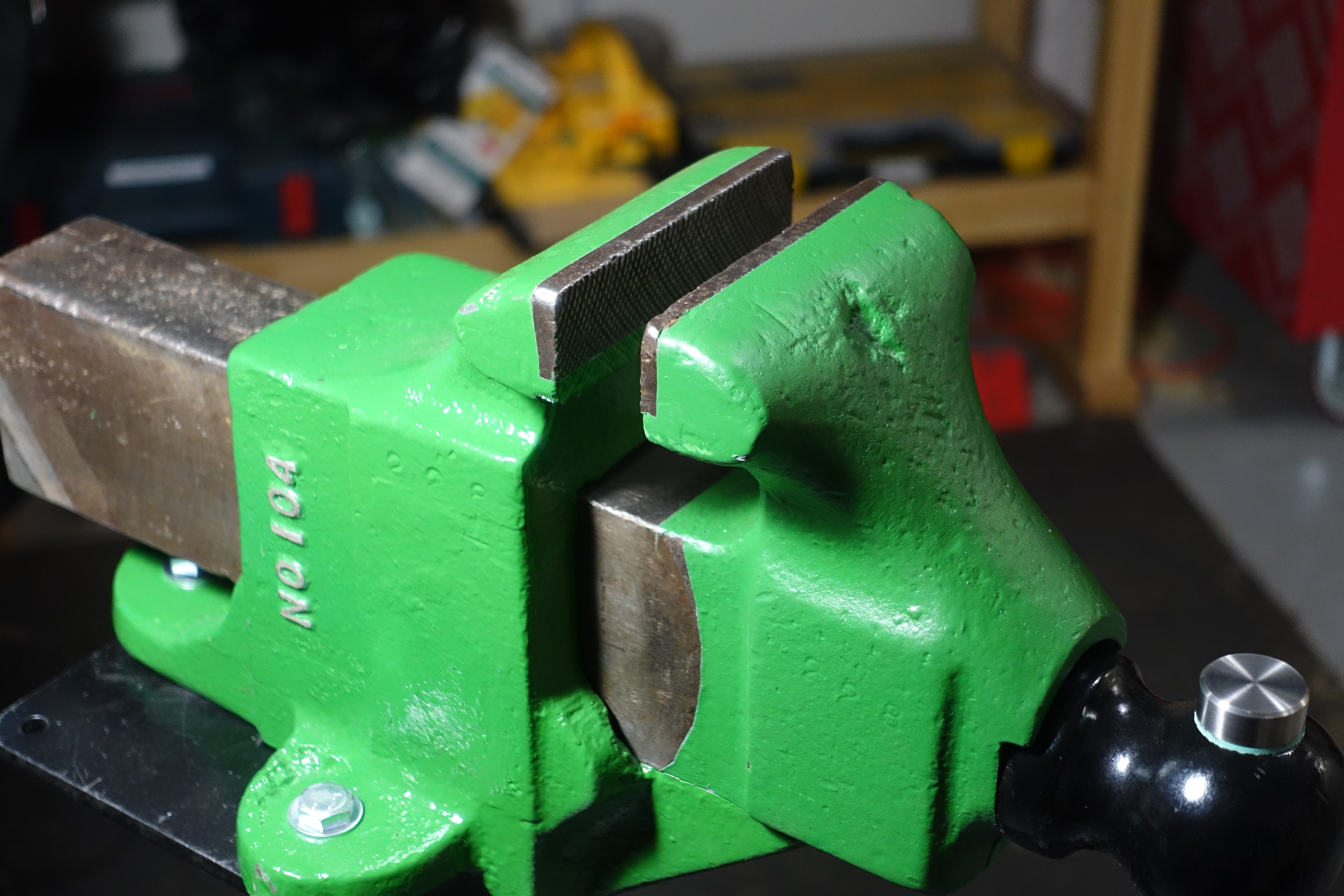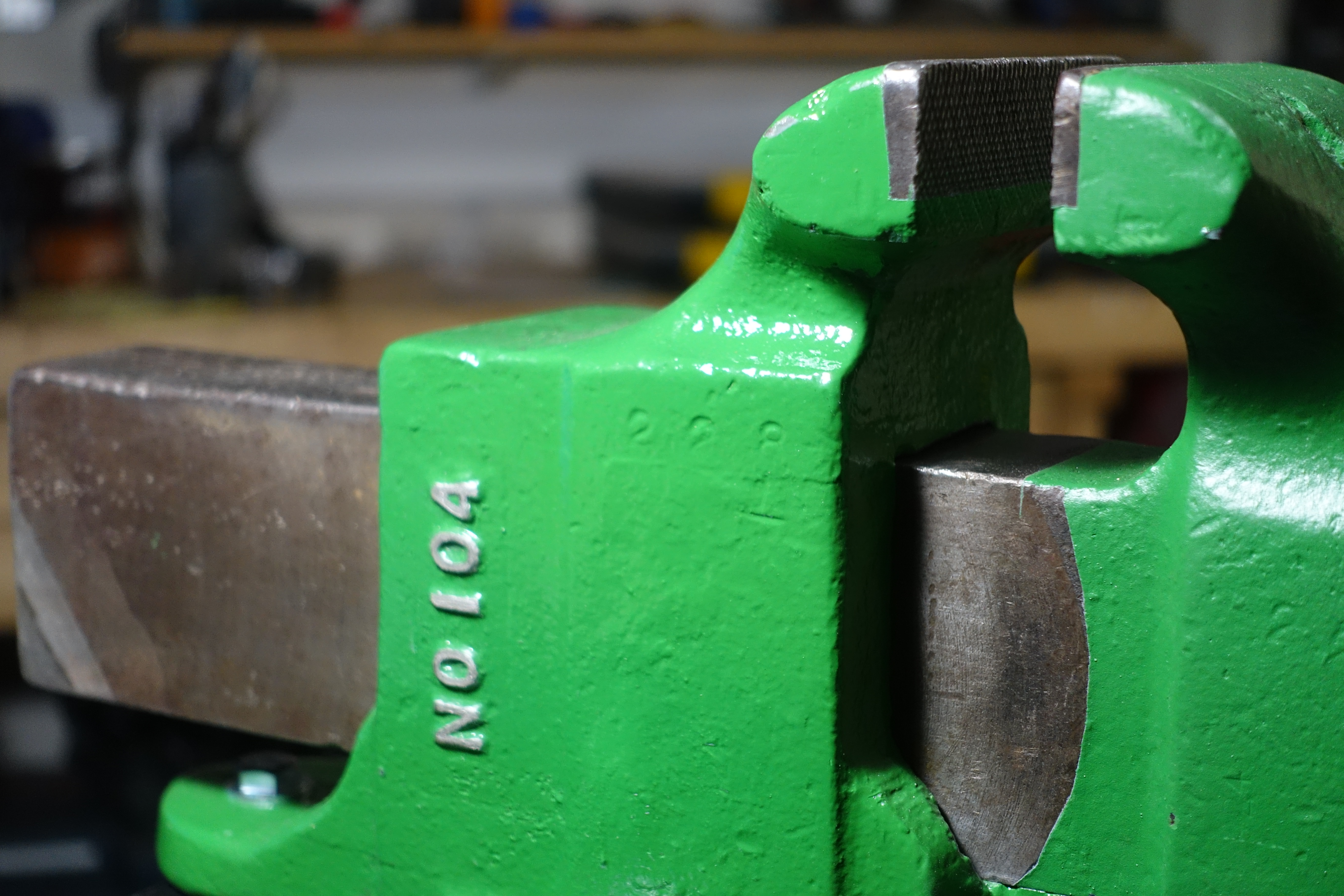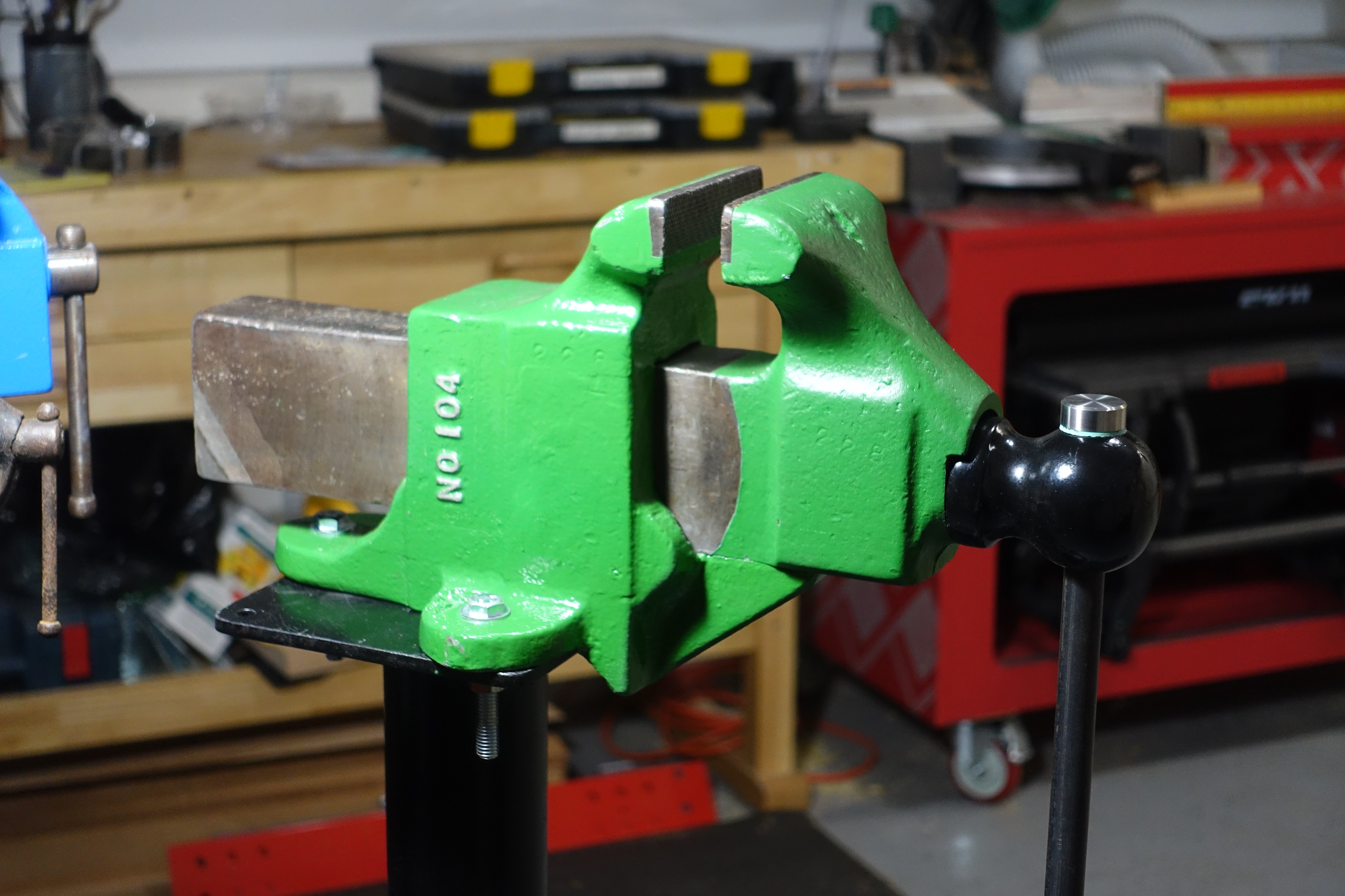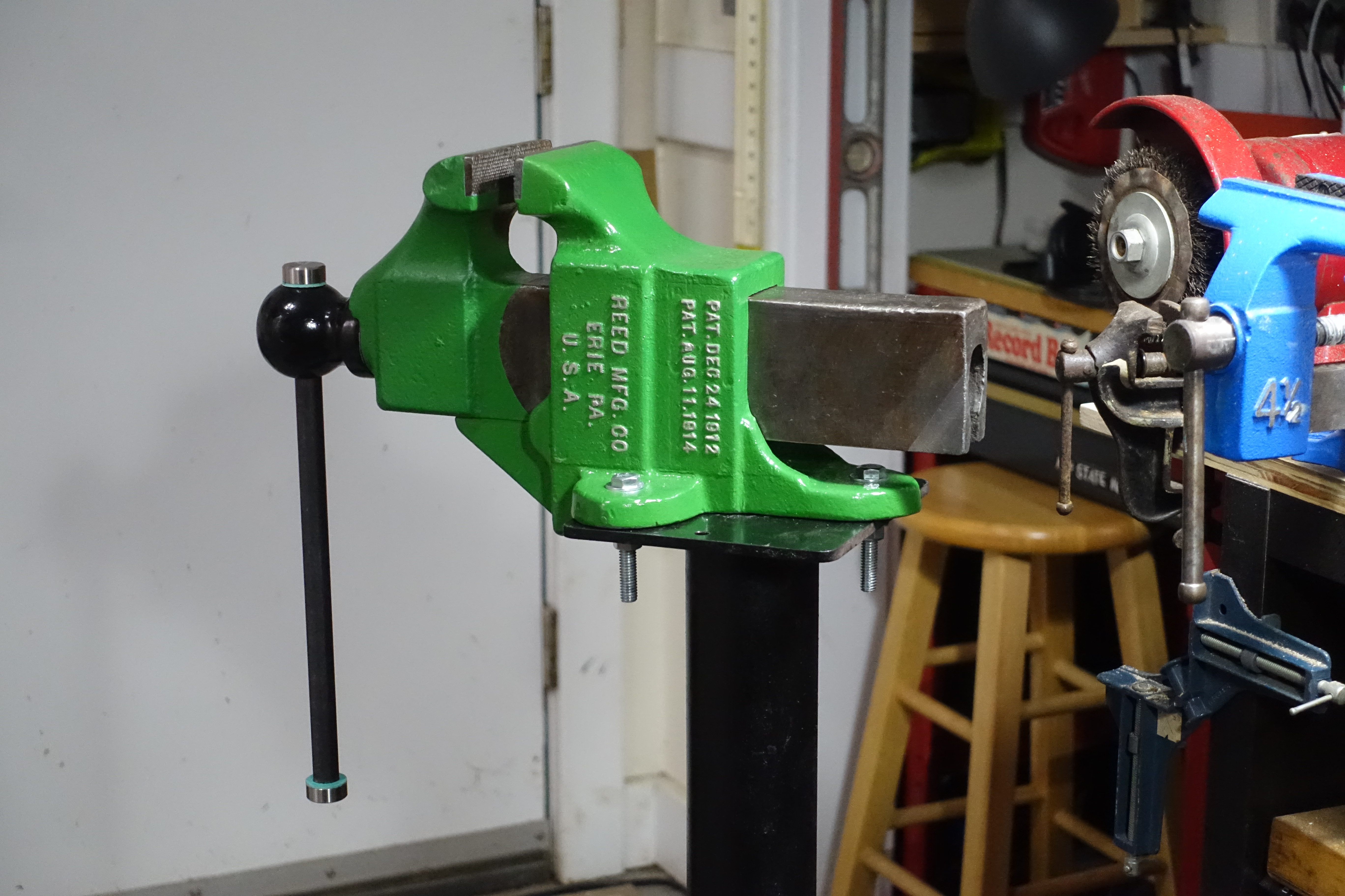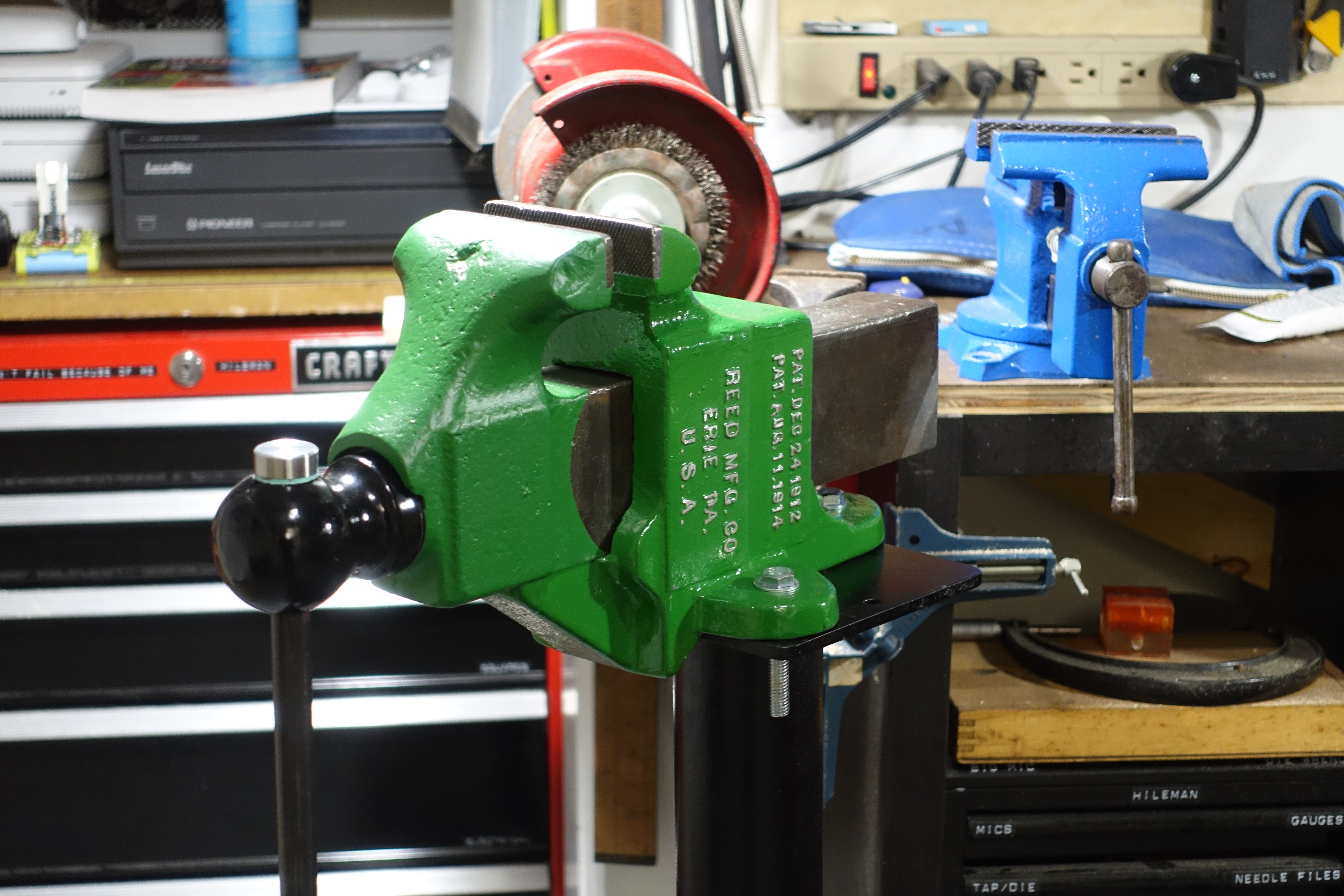 I was given this Reed No. 104 bench vise from my great-grandads shed. It had some pitting and was covered in debris, but the layers of dirt and grease had kept it in pretty good condition. Over the course of a few evenings spread across a few months, I disassembled it, cleaned it, painted it, and set up a pedestal stand for it, since I didn’t have a good spot open on my workbenches.